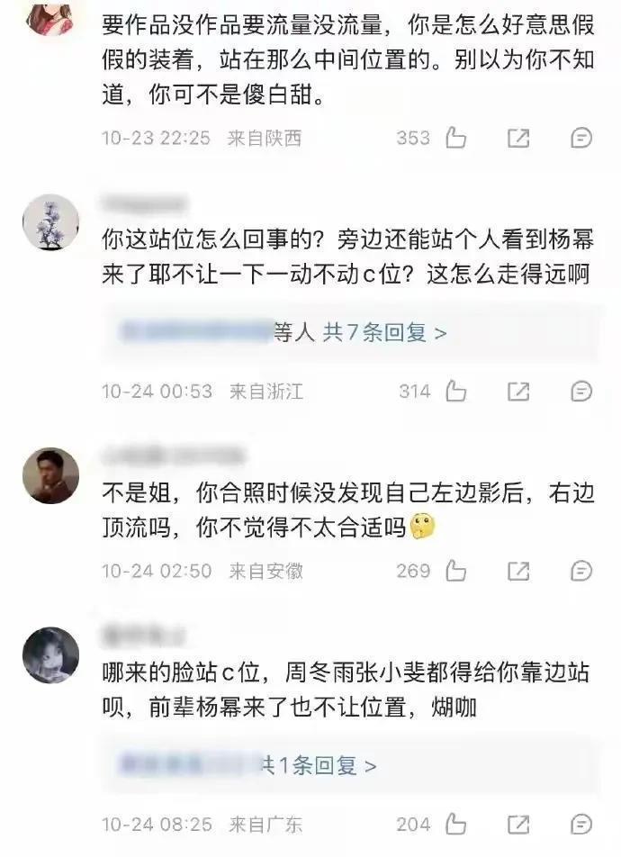 钟楚曦就站在旁边,她的脚还停在原来的位置,旁边的空隙能塞进一个人,可她就是没挪,于是,杨幂和刘亦菲只能隔着半个人的距离站着,两人的礼服都很修身,却连衣角都没碰到。刘冲站在旁边,叹了口气,转身挤到了人群后面,不小心又踩到了别人的裙子。事后的舆论:“心机女”被骂惨,55岁的她成了“赢家”第二天,#钟楚曦 心机女#的话题上了热搜。网友翻出大合照的视频,指着钟楚曦的脚说:“她明明可以往旁边挪一点,却故意占着位置,让杨幂没地方站”“野心都写在脸上了,太会抢镜头”。钟楚曦的评论区里,全是“太心机”“输了格局”的留言,连她之前的造型争议都被翻了出来。
